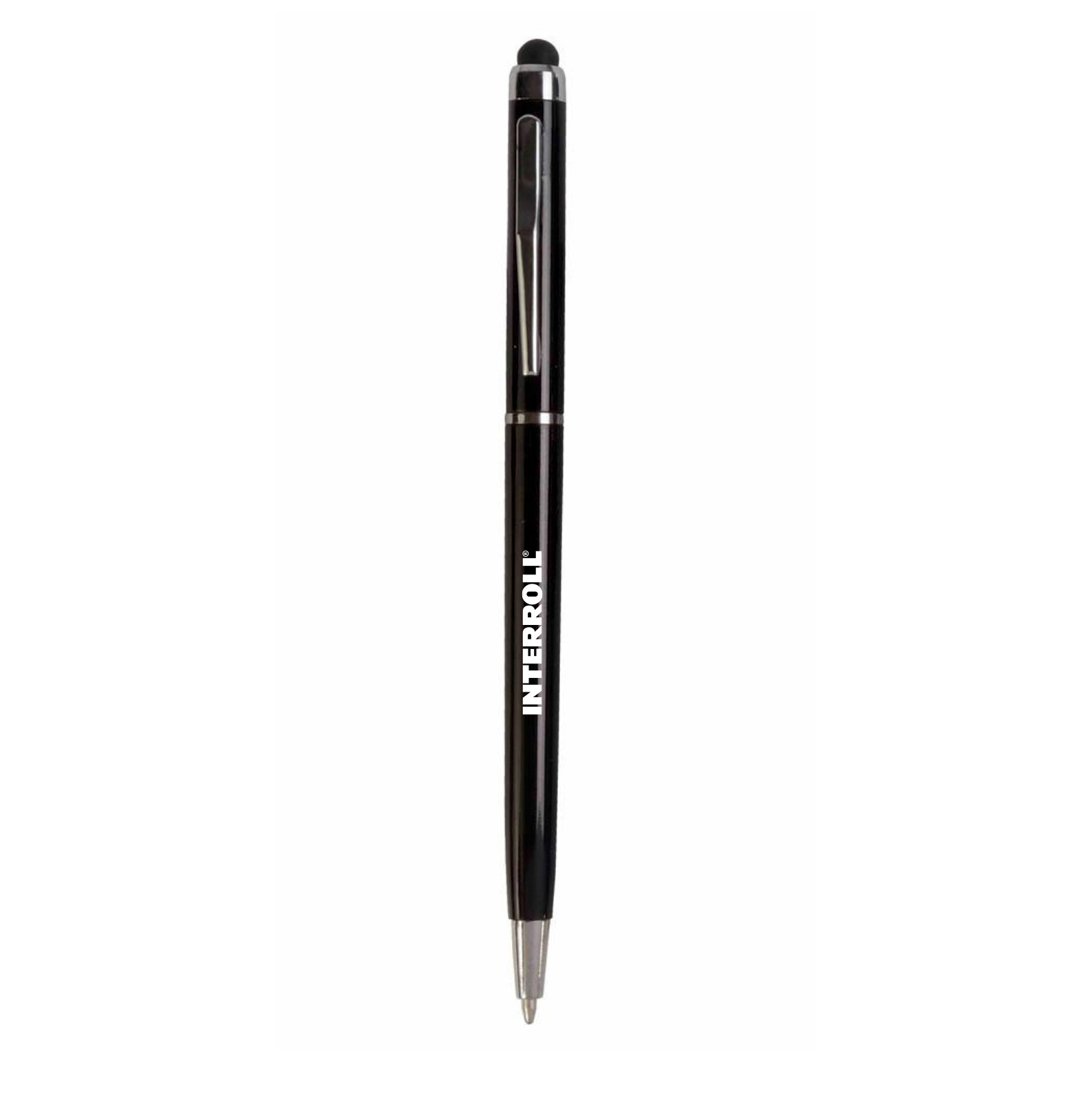 Plastic twist pen with touch screen eraser and metal clip personalized with INTERROLL logo